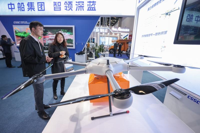 美国商务部继续开放中国制无人机的进口。图为中国制的海上应用型无人机去年11月在中国国际应急管理展览会上展示。(中新社)