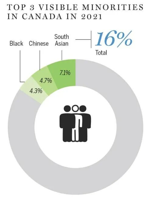 加拿大移民模式正在发生变化,近三分之二的新移民出生于亚洲,包括中东地区。近70%的加拿大人——略超过2500万人——自称是白人,这使得白人在加拿大几乎所有地区都占多数,只有温哥华(42%)、多伦多(40.7%)、西北地区(37.9%)和努纳武特地区(10%)除外。