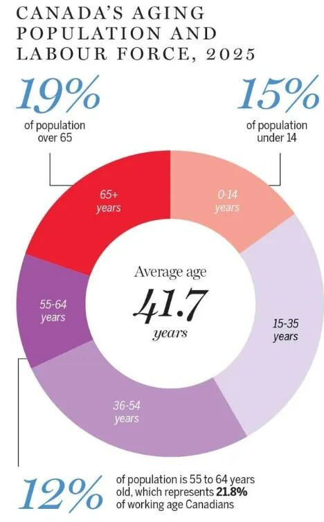 加拿大正面临严峻的人口老化挑战。65 岁以上人口达 810 万,首次超过 14 岁以下儿童人数。2024 年全国生育率降至 1.25,创历史新低,远低于人口更替水平。
