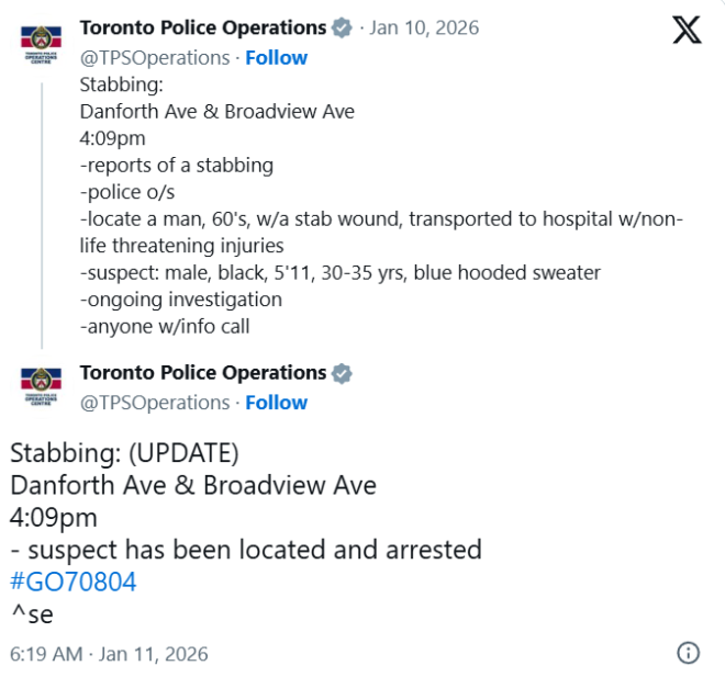 多伦多警方在社交媒体上表示,警方于下午4:09左右接到报案,赶赴Danforth Avenue与Broadview Avenue一带,处理一起刺伤事件。