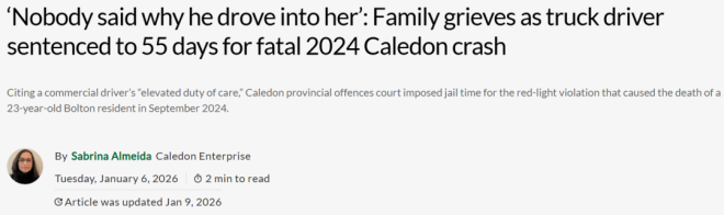 2026年1月5日,安省Caledon的省级违规法庭作出判决:一名商业卡车司机因疏忽驾驶致人死亡,被判55天监禁。