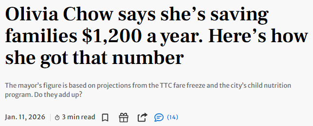 1,200加元这一数字主要基于她的两项核心政策:冻结TTC票价和扩大校园营养计划。