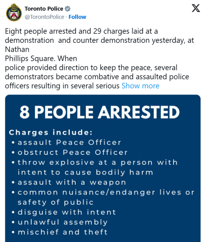多伦多警方表示,在周六于多伦多市中心发生的一场被警察协会形容为“激烈”的示威活动后,警方逮捕并指控了8人,其中3人涉嫌袭击警察。