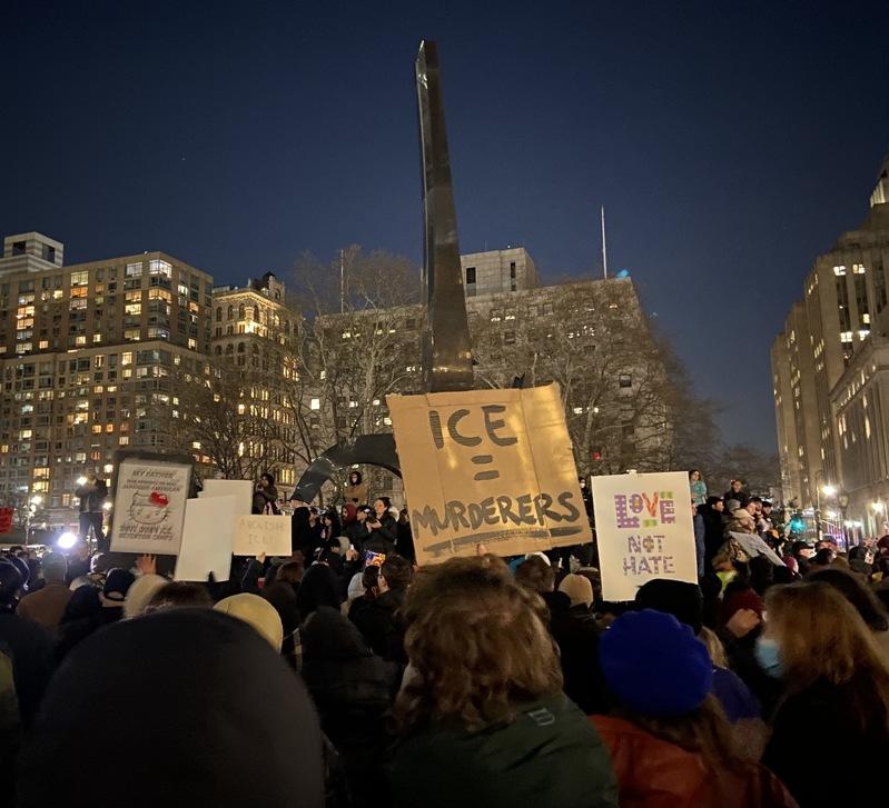 明州枪击事件7日发生后,纽约移民联盟(NYIC)等维权机构在当日和次日分别组织抗议活动,参与者近千人。国土安全部长诺姆(Kristi Noem)8日前往曼哈顿下城世贸中心召开记者会,亦吸引了不少民众前往抗议。