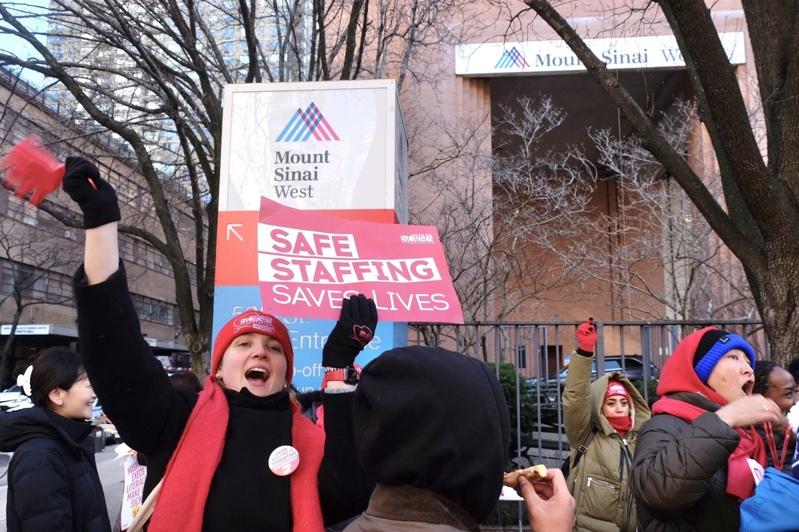 西奈山西区医院的纠察线设在院外的人行道上,医院的各出入口、尤其是供急救车通行的车道均保持畅通,院内值班的医护及患者亦未受到罢工影响。