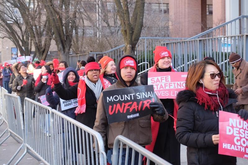 发生罢工的包括位于布朗士的蒙特菲奥里(Montefiore)以及位于曼哈顿的长老会(NewYork-Presbyterian)和西奈山(Mount Sinai)医疗系统,共十所医院。参与罢工的西奈山西区医院(Mount Sinai West)运行委员护士乔治(Bobin George)介绍,该院的罢工从12日早6时开始,参与者总计700余人。罢工的护士会轮班前往医院外的纠察线驻守,组织方为他们提供餐食、饮品以及保暖装备。