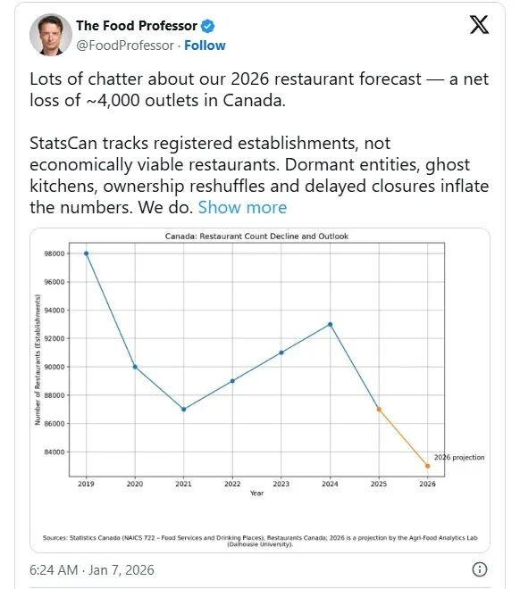 而情况可能还没见底。该研究预测,到 2026 年,加拿大还将有约 4,000 家餐厅倒闭。