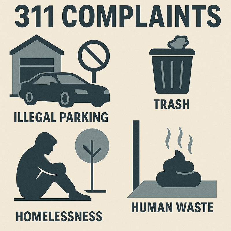 2025年,露宿者营地与无家可归问题仍属首要关切。去年夏季,市政府添加311系统中的无家可归专项分类,将露宿者营地投诉与其他诉求区分开来,例如非营地内的游民游荡、露宿或需要援助的情况(市政府仍建议对过量吸毒等紧急危机情况拨打911)。市政府表示此举有助于调度员派遣合适团队处理问题。两类投诉合计超过4万3000起,均位列投诉量前15名。