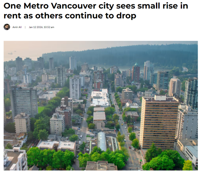 Rentals.ca 的数据显示,2025年12月,大多数大温城市的平均要价房租继续明显下降,但本拿比(Burnaby)成为唯一一个月环比上涨的城市。