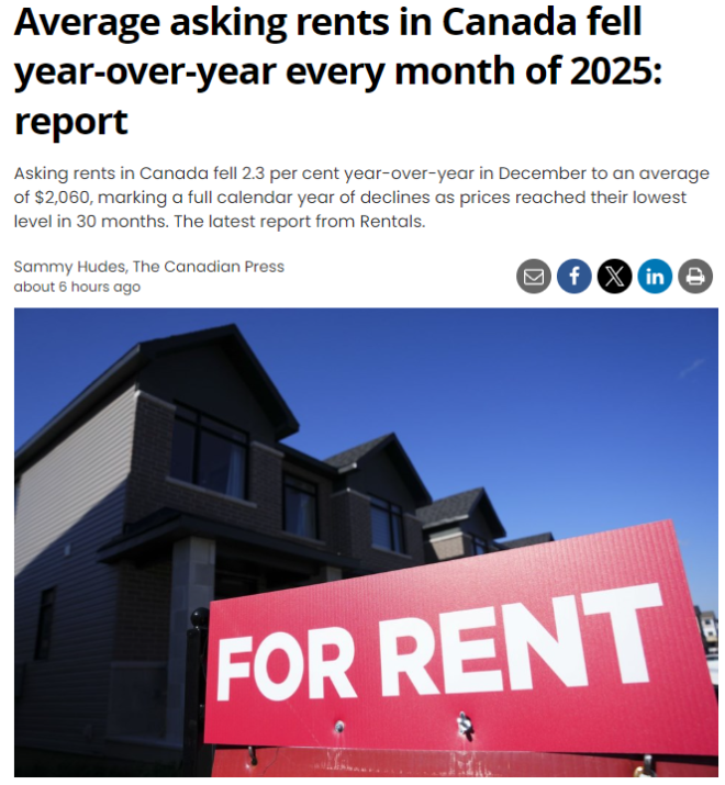 根据 Rentals.ca 与 Urbanation 最新联合发布的报告,2025年12月,加拿大全国平均要价房租同比下降2.3%,降至每月2,060加元,创下过去30个月以来的最低水平。更重要的是,这已经是房租连续第15个月同比下跌。