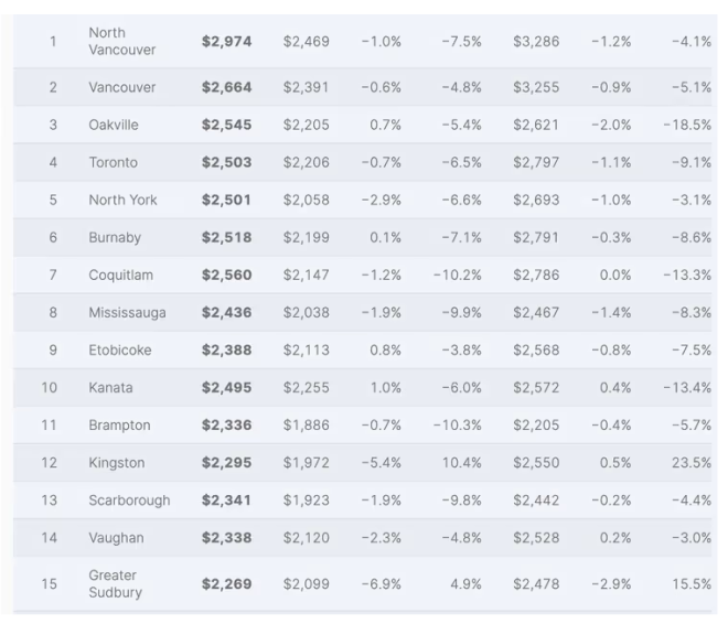 值得注意的是,大多数大温城市的平均房租仍然高于全国平均水平2,060加元。
