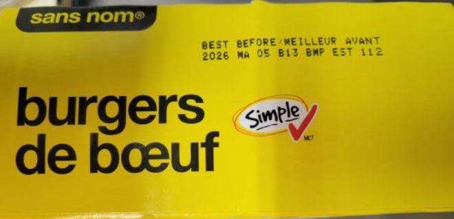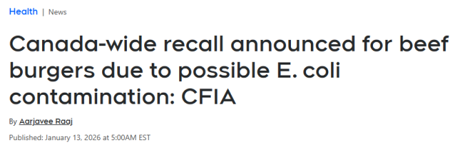 加拿大食品检验局(CFIA)发布全国性召回通知,因可能存在大肠杆菌(E. coli)污染,召回no name品牌的牛肉汉堡。