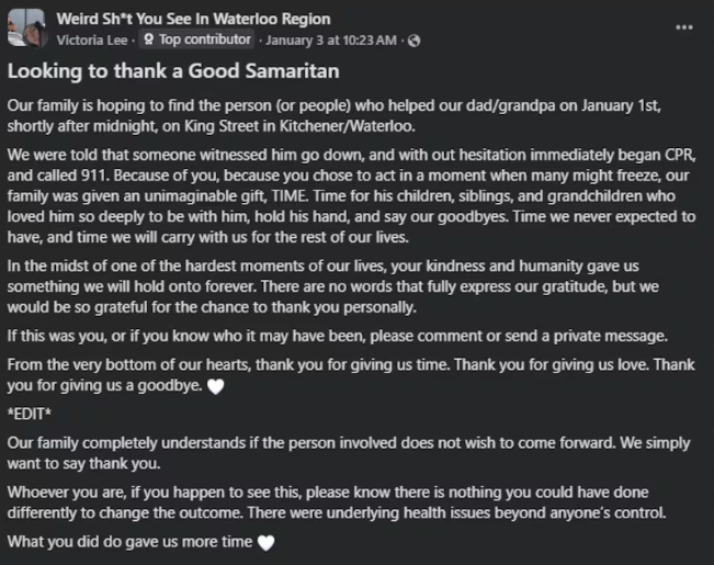 新年前夜深夜,Ron Snook在安省基奇纳(Kitchener)的King Street附近突然倒下。