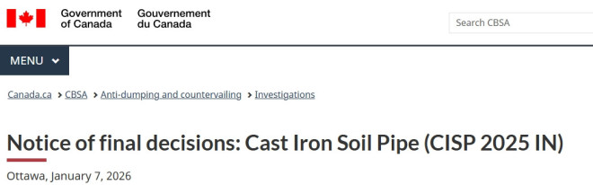 加拿大边境服务局(CBSA)于2026年1月7日发布公告,根据《特殊进口措施法》(SIMA)作出最终裁定,确认原产于或出口自中国的铸铁排水管(Cast Iron Soil Pipe,简称 CISP) 存在倾销和补贴行为。