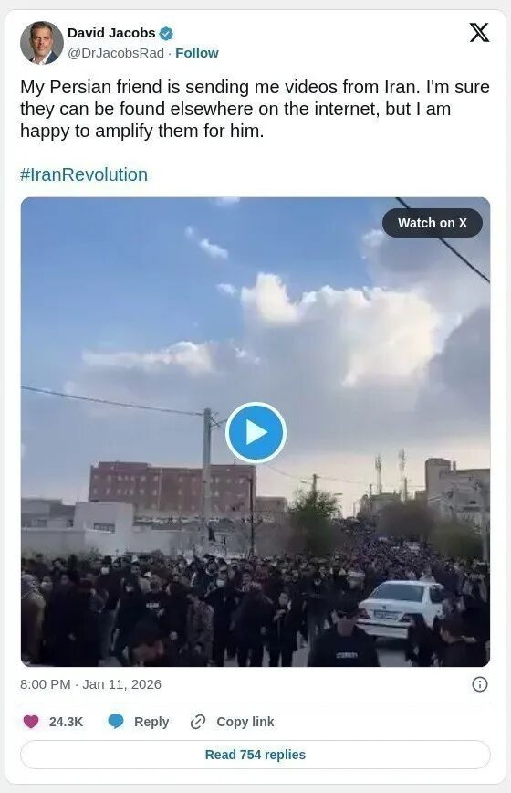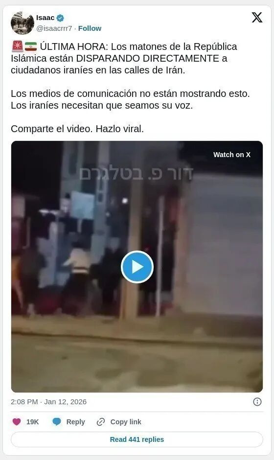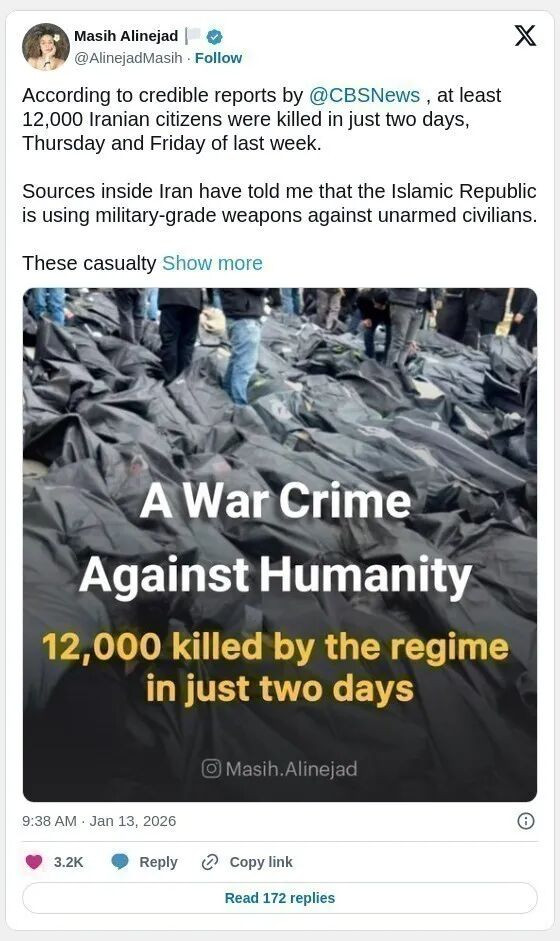 根据CBS新闻的报道,在上周四和周五两天内,至少12000伊朗人遇害。