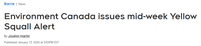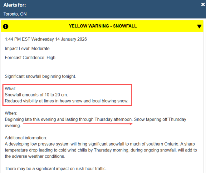 与此同时,1月14日(周三),加拿大环境部(Environment Canada)提醒公众,随着一个低气压系统进入安大略南部(包括大多伦多地区),未来24小时内将迎来10至20厘米的降雪。
