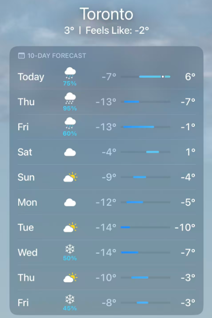 美国GFS模型同样预测了大量降雪,天气网络(The Weather Network)的14天预报显示,多伦多在同期可能累计降雪达24厘米。