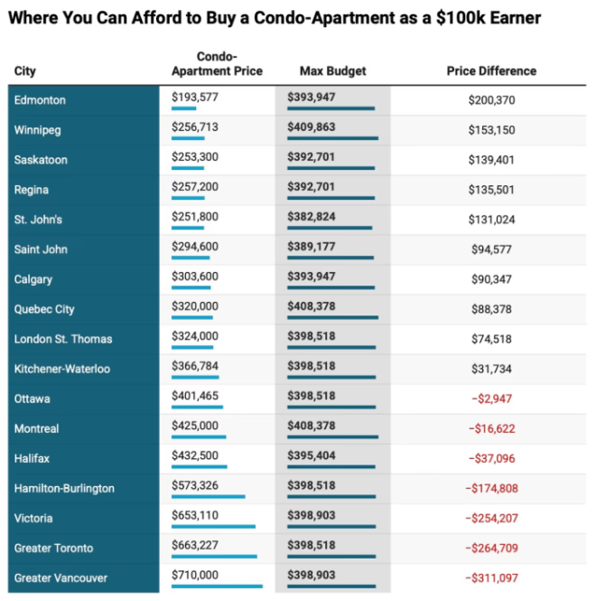 不过,在GTA,公寓的平均价格高达 66.32 万加元。这意味着,即便年入 10 万加元、最高购房预算为 39.85 万加元,仍将面临26.47 万加元的差距。
