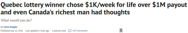 去年,年仅20岁的魁北克女子Brenda Aubin-Vega,真的遇到了这道题,她赢得了魁北克彩票公司Loto-Québec旗下“终身赢家”(Gagnant à vie)彩票的最高奖项。该彩票对外宣传的奖品是“终身每周1000加元”,但在细则中也注明,中奖者可以选择一次性领取100万加元。她的选择是,放弃了一次性100万,选择了“终身每周1000”。