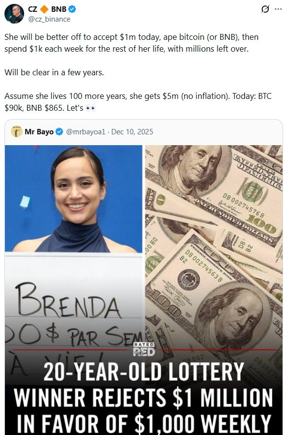 赵长鹏在社交平台X上发文称:“她如果今天拿100万,加仓比特币(或BNB),然后每周花1000加元,一辈子下来还能剩下几百万。几年后就会很清楚。假设她还能活100年,那也不过是拿到500万(未考虑通胀)。现在:比特币9万,BNB 865。走着瞧。”