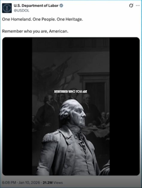 联邦劳工部(USDOL)10日在X平台贴出一段影片并搭配文本:「一个家园,一个民族,一个传承。美国人,记住你是谁。」引发批评,网友认为这则贴文的风格与手法和纳粹德国独裁者希特勒(Adolf Hitler)的内核口号如出一辙,「一个民族、一个帝国、一个领袖」(Ein Volk, Ein Reich, Ein Führer!)。