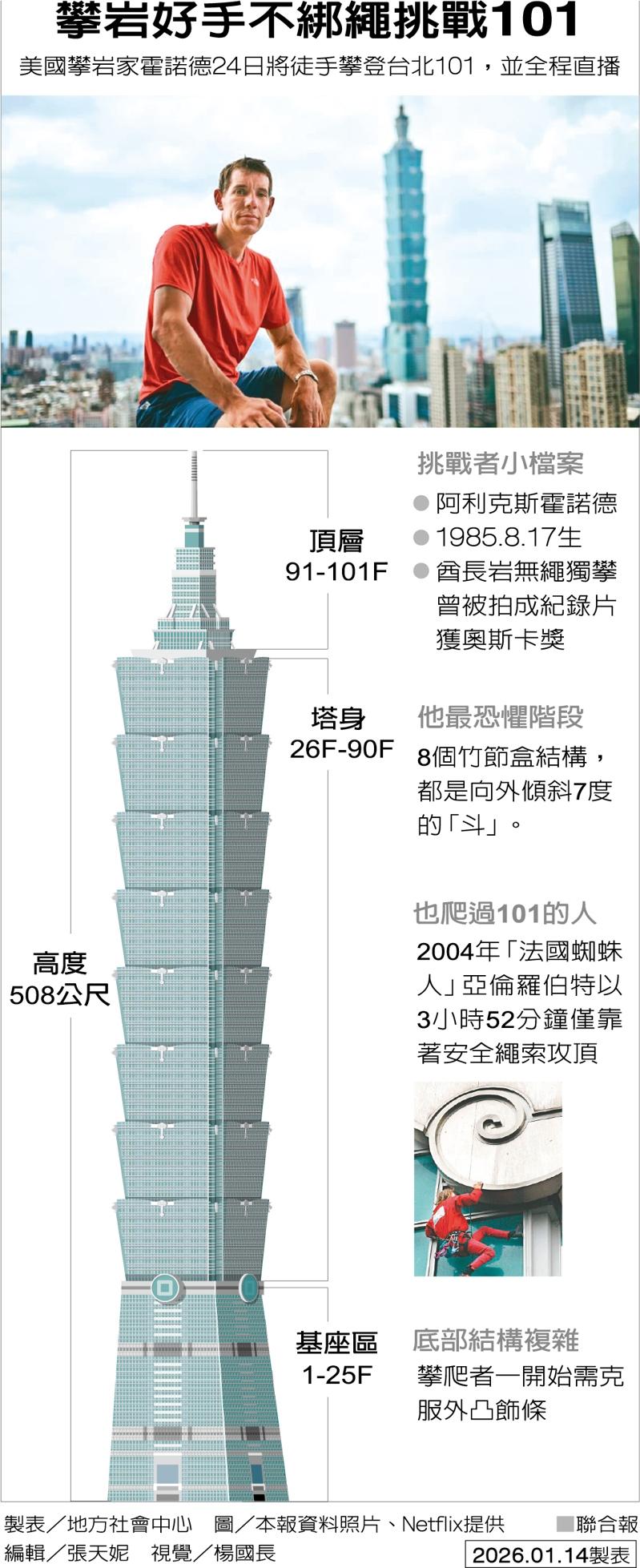 攀岩好手不绑绳挑战101。 (制表/联合报)