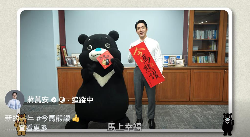 蒋万安15日也在脸书贴文表示,「2026台北市政府马年春联来啰!」今年的马年春联,我们找来台北市最可爱的吉祥物 熊赞Bravo。结合马年与熊赞,取台语谐音「今嘛上赞」,就是 「今马熊赞!」 「今年的春联字体,同样是我亲笔书写的。用我手写的祝福,希望市民朋友新的一年,每个当下都是最美好的时刻!」