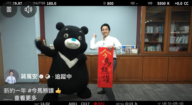 蒋万安15日一早脸书,也贴出他写春联的小花絮影片,今年北市府得马年春联「今马熊赞」,特别也找来台北市最可爱的吉祥物熊赞Bravo,一同来写春联,并且与蒋万安PK挑战。