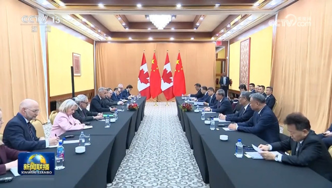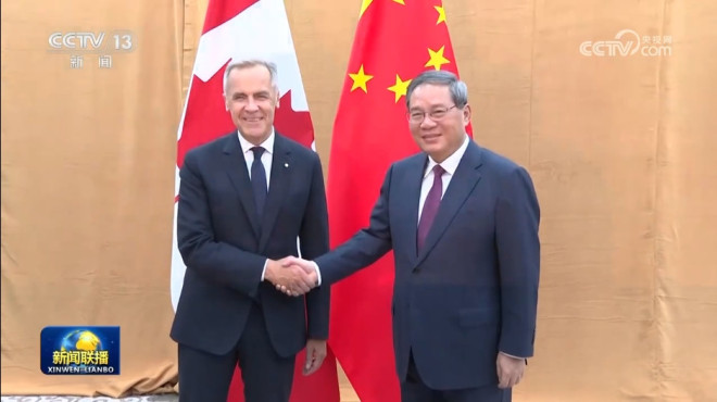 国务院总理李强1月15日下午在北京人民大会堂同来华进行正式访问的加拿大总理卡尼举行会谈。