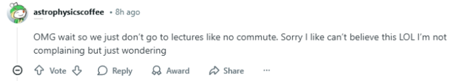 “我的天啊,等等,所以我们不用去上课,不用通勤吗?不好意思,我简直不敢相信哈哈哈哈,我不是在抱怨,只是好奇而已。”