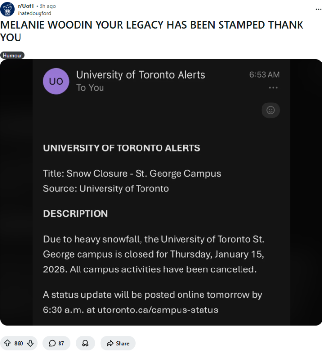 在Reddit论坛的多伦多大学话题下,一位学生发帖称:梅兰妮·伍丁(校长),你的传奇已被铭记,谢谢你。