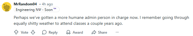 “或许我们现在换了个更有人情味的行政人员。记得几年前,有过同样糟糕的天气,但我还是得去上课。”