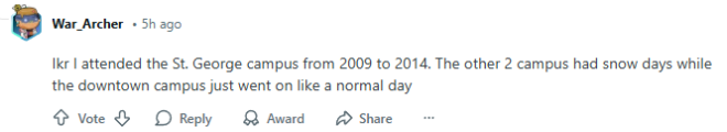 “我知道!我2009年到2014年在St. George校区就读。其他两个校区因为下雪停课了,而市中心校区照常上课。”