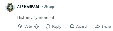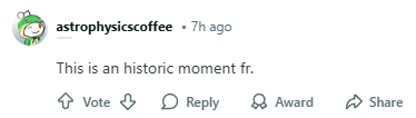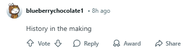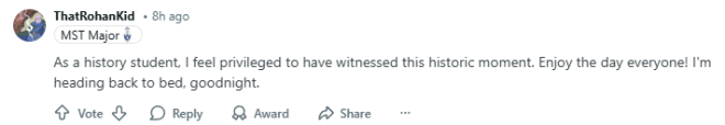 “作为一名历史系学生,我很荣幸能够见证这一历史性时刻。祝大家今天愉快!我要回去睡觉了,晚安。”