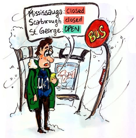 据悉,多伦多大学St. George校区以几乎从不关门而出名,就算市中心以外、也就是大多数学生通勤来的地方天气已经很糟了。