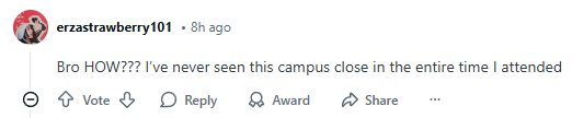 该校区上一次因暴雪而停课,发生在2019年1月。但是,校方在晚上5:43才宣布取消课程、实验和辅导课。这引发了巨大争议,许多学生在网上吐槽学校决定得太晚。