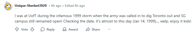 “1999年那场极其恶劣的暴风雪来袭时,我正在多伦多大学就读。当时军队被调来清理多伦多城市街道,而St. George校区竟然还开放着!查了一下日期,几乎就是今天(1999年1月14日)……哎,孩子们,好好享受吧!”