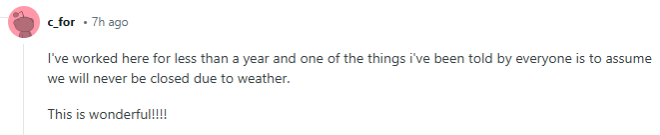 “我在这里工作不到一年,大家都跟我说过,千万别指望我们因为天气而停课。太棒了!!!!”