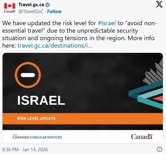 周三晚间,加拿大政府还将对以色列的旅行风险级别上调至“避免非必要旅行”,理由是“地区安全形势不可预测,紧张局势持续”。