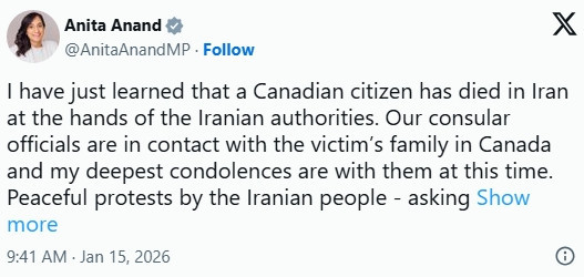 加拿大外交部长阿南德**(Anita Anand)周四在社交媒体上表示,在伊朗全国范围内爆发大规模反政府抗议之际,一名加拿大公民“死于伊朗当局之手”。