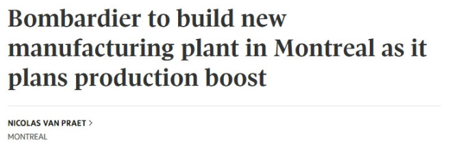 庞巴迪公司(Bombardier Inc)将投资约1亿加元,在蒙特利尔建设一座新的制造工厂。这家高端公务机制造商正计划提升产能,以满足行业强劲的市场需求。