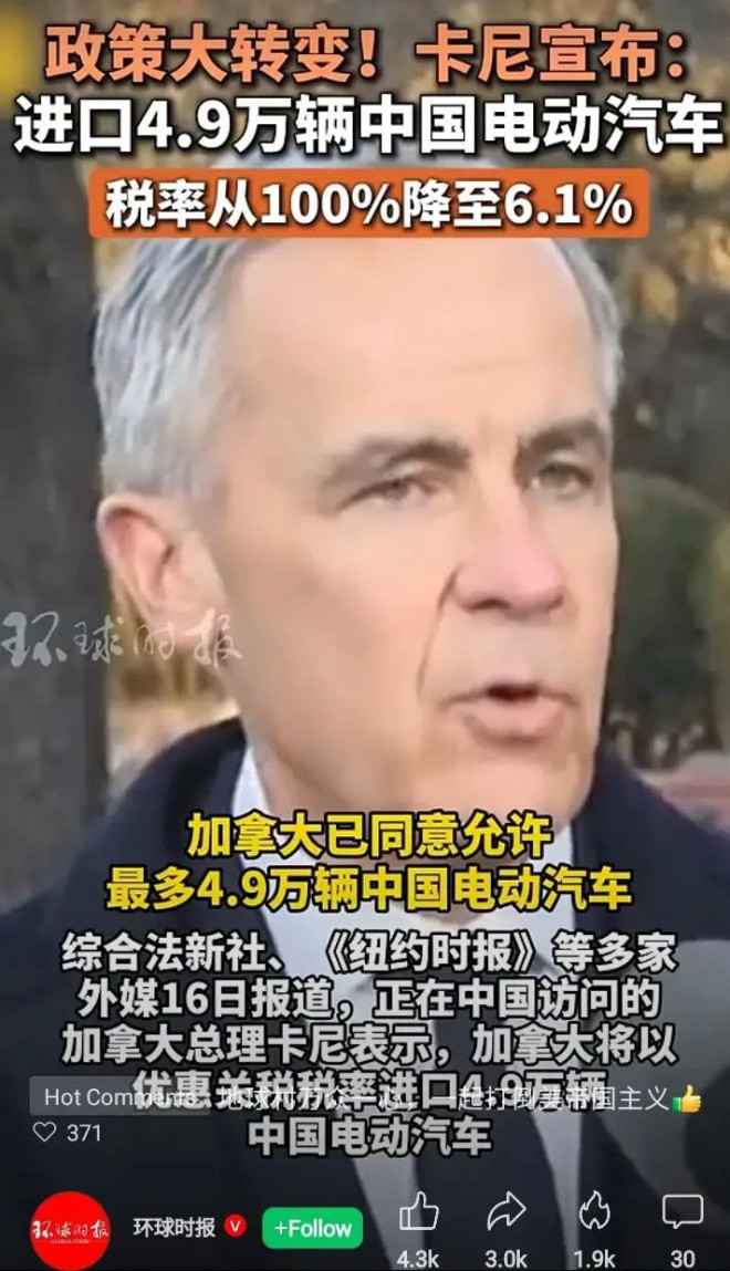 签到 欢迎!登录你的帐户 您的用户名 您的密码 Forgot your password? Get help 找回密码 恢复您的密码 您的电子邮件 密码将通过电子邮件发送给您。 涉中国电动汽车,加拿大总理卡尼宣布大消息 2026年1月16日 加拿大新闻 分享 Facebook Twitter Pinterest WhatsApp 综合法新社、《纽约时报》等多家外媒16日报道,正在中国访问的加拿大总理卡尼表示,加拿大将以优惠关税税率进口4.9万辆中国电动汽车。 卡尼16日告诉记者:“加拿大已同意允许最多4.9万辆中国电动汽车进入加拿大市场,适用6.1%的最惠国关税税率……这恢复到了贸易摩擦前的水平。” 《纽约时报》称,加拿大将降低部分中国电动汽车的关税,这一重大政策转变是加拿大总理卡尼在对北京进行“具有里程碑意义”的访问期间宣布的。此前在2024年,在美国拜登政府的要求下,加拿大对中国电动汽车征收100%的关税。 热点 卡尼访华签署能源、木材、警务、旅游等6项协议,但关税僵局未破 - 安省恐遭100cm雪灾! 大多伦多”黄色警报”生效: 暴雪马上开始! admin - 3名宾顿男子实施有组织支票诈骗,跨省骗银行50万加元被捕 admin - 赖清德:面对中国威权扩张 感谢日相展现对台海和平重视 admin - 华清池杨贵妃露点雕像遭举报不雅 中官媒:扼杀创作活力 admin - 商务部:美台达协议 台湾半导体公司加码对美投资5000亿 admin - 前一篇文章暴雪压城!多伦多紧急升级应对:启动重大暴雪状态+加派人手清雪下一篇文章重磅!加拿大同意进口4.9万辆中国电动车 换取中国下调油菜籽关税 卡尼访华敲定加中战略伙伴关系,电动车入市,获赴华免签承诺 - 2026年1月16日 重磅!加拿大同意进口4.9万辆中国电动车 换取中国下调油菜籽关税 - 2026年1月16日 习近平会见加拿大总理卡尼 - 2026年1月16日 发表评论取消回复