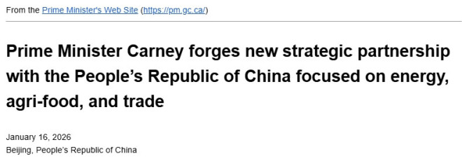 1月16日,加拿大总理办公室发布卡尼访华新闻稿,题为:卡尼总理与中华人民共和国建立新的战略伙伴关系,聚焦能源、农产品与贸易。