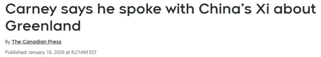 加拿大总理马克·卡尼表示,他当天在北京与中国国家主席习近平会晤时,讨论了格陵兰(Greenland)的主权问题,以及美国总统针对该地区发出的威胁。