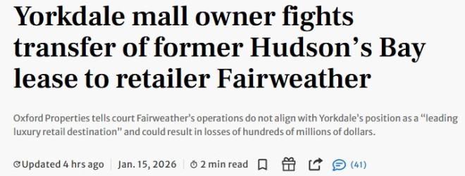 购物中心业主Oxford Properties周三在安省高等法院向法官表示,其不同意负责原Hudson’s Bay在Yorkdale租约的法院指定接管人FTI Consulting提出的转租方案。该方案将允许Fairweather以 “Ailes” 品牌在该铺位经营一家新的百货商店。