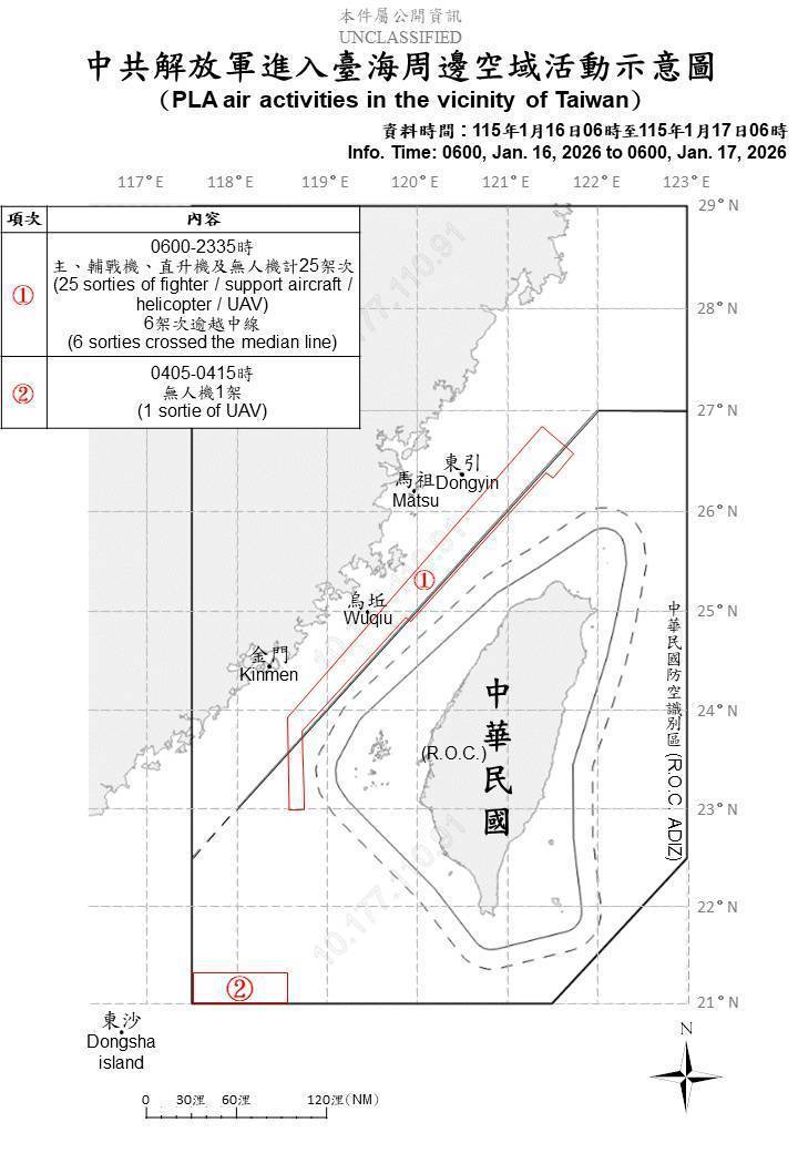 根据军方公布的航迹示意图,从昨天清晨6时到夜间11时35分止,发现中国战斗机、辅战机、直升机及无人机计25架次在台海中线沿线活动,其中6架次曾逾越中线在台湾北部、中部空域活动,同时进入台湾西南空域活动。