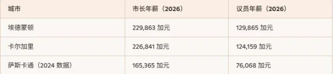 市长薪资按照市议员调整后薪资的 2.02 倍计算。除基本薪酬外,11 名民选官员每年还将获得 3,048 加元的福利补贴,以及交通津贴和相关开支补助。福利补贴用于覆盖扩展医疗、牙科及团体人寿保险等费用,与市府豁免员工的福利标准一致。