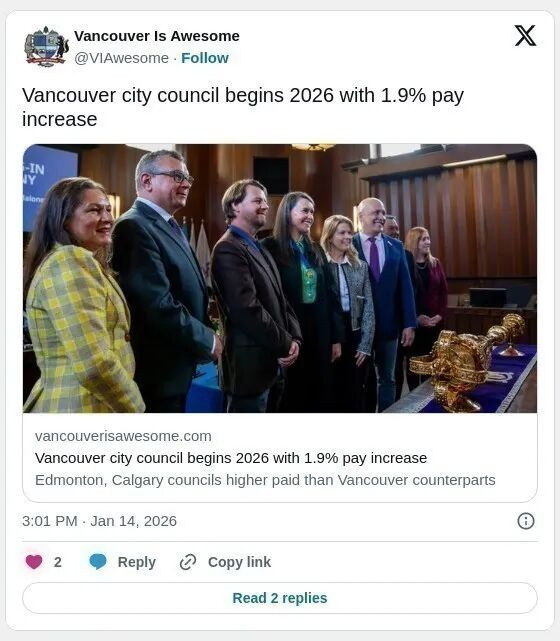 刚在2026年预算中裁掉了400个市政工作岗位,其中包括约270个加拿大公共雇员工会(CUPE)的职位之后,温哥华市议会自2026年1月1日起实施 1.9% 的薪资上涨,市长薪酬增至21.4万加元.