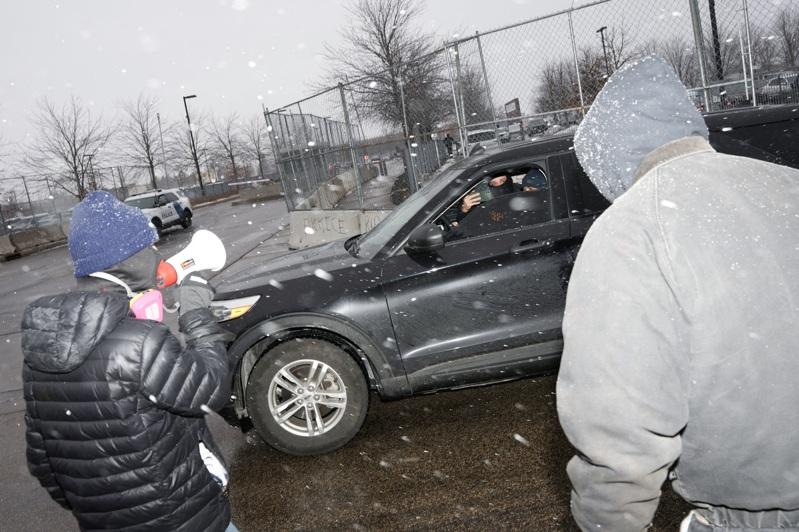 一名ICE探员驾车驶入联邦大楼时,明州抗议民众拿着免提器对他叫嚣。(路透)