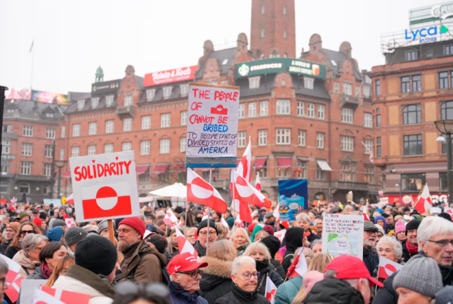 “这对全世界都很重要,”丹麦抗议者伊莉丝·里奇(EliseRiechie)在手持丹麦和格陵兰国旗接受美联社采访时说。“世界上有很多小国。没有一个是待价而沽的。”